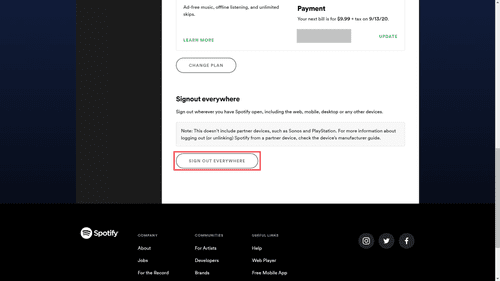 Restart the Spotify app. I am just a thirteen year old child trying to help out. To sign out of all devices however scroll down to the bottom of the page and click the Sign Out Everywhere button listed underneath the Signout Everywhere category.